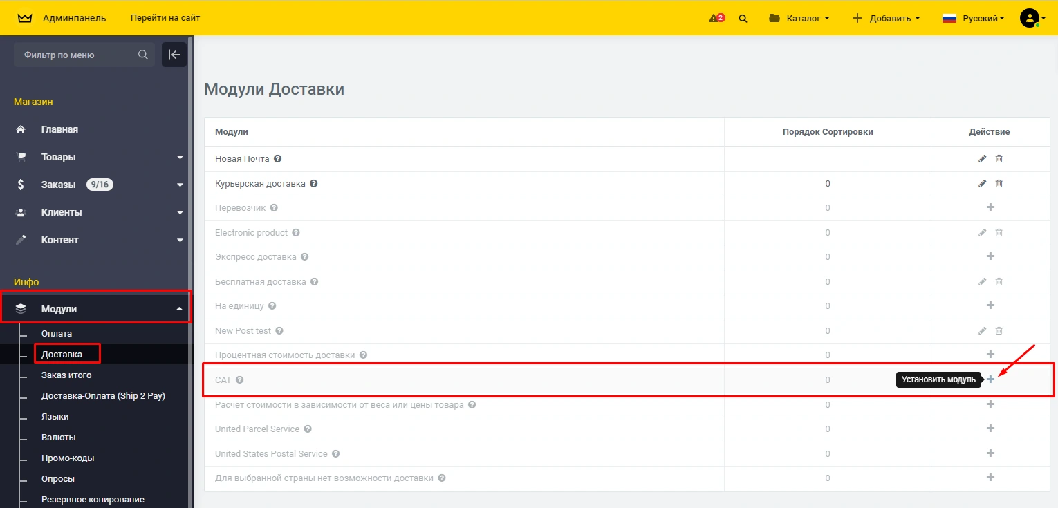 Подключение модуля доставки "САТ"