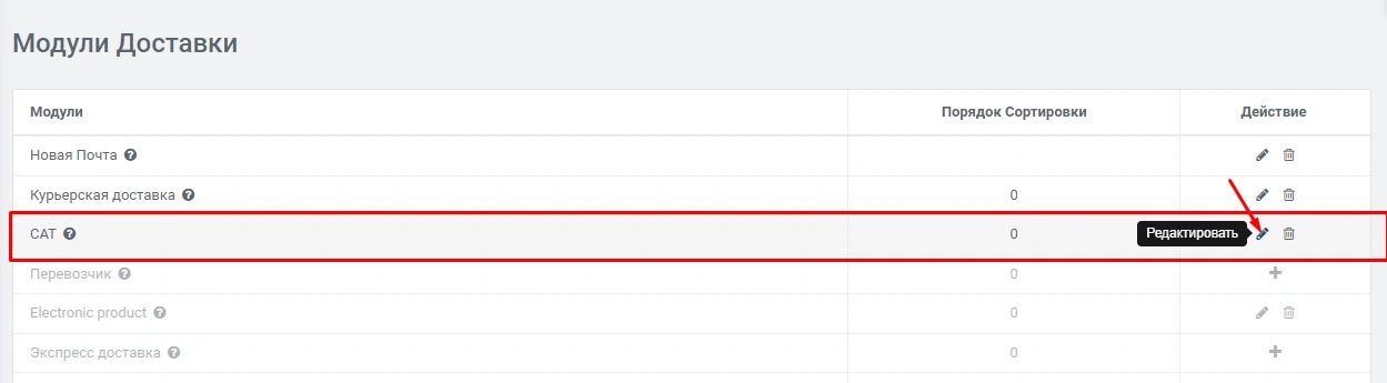 Для начала включите сам модуль "САТ", для этого в панели администрирования перейдите «Модули» -> «Доставка» -> «САТ» если он у Вас не активный нажмите на иконку "+"