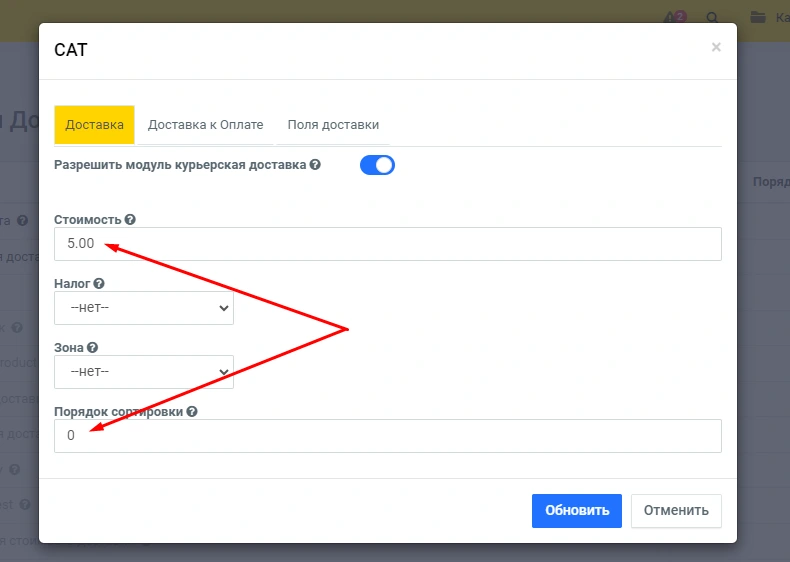 Вы перейдете в модальное окно настройки модуля, здесь Вы можете выставить например порядок сортировки и стоимость