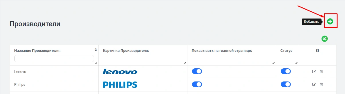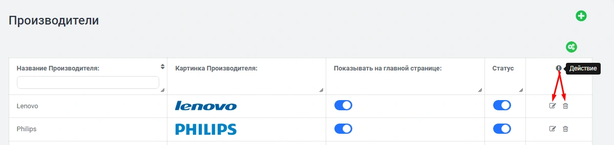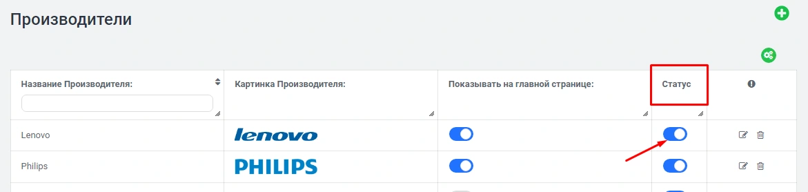 Для отображения информации о производителе на сайте нужно переключить ползунок в колонке “Статус” и активировать его.