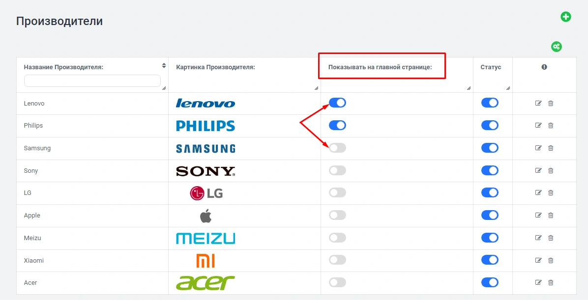 Для отображения производителей на главной странице нужно переключить ползунок в колонке "Показывать на глывной странице"