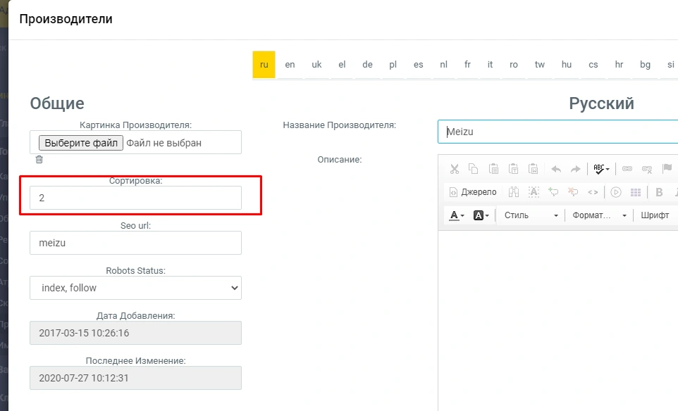 И также Важным моментом являється сортировка брендов, Вы можете выставить приоритет вывода для каждого производителя. Для этого в карточке производителя в колонке "Сортировка" выставите нужный приоритет от "0", где ноль будет большим приоритетом.