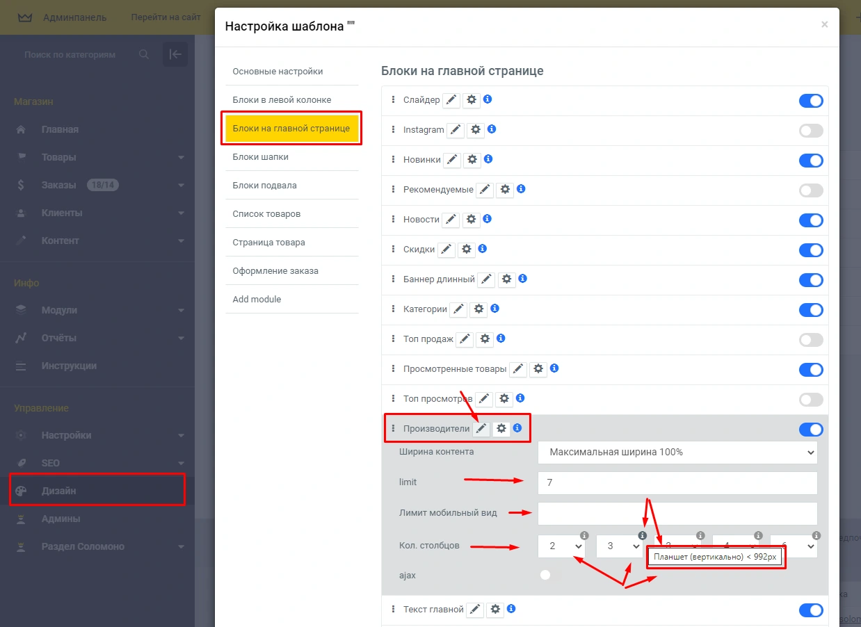 Команда Solomono разработала удобный функционал для работы с блоком производителей, где Вы сможете указать какое количество логотипов/блоков будет выводиться как для десктопа, так и для мобильной версии, также необходимое количество логотипов/блоков можно выставить и для разных разрешений, для каждой колонки есть подсказка для того или иного разрешения экрана.