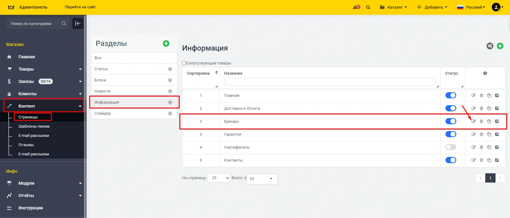 Для того что бы вывести ссылку БРЕНДЫ на главной странице в шапке, то в панели администрирования: -> «Контент» -> «Страницы» -> «Информация» -> «Бренды» нужно нажать на иконку "редактирования":