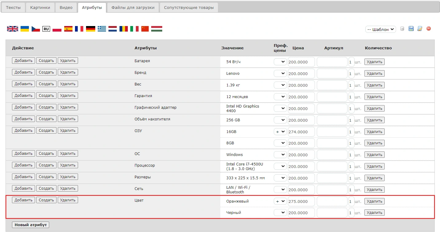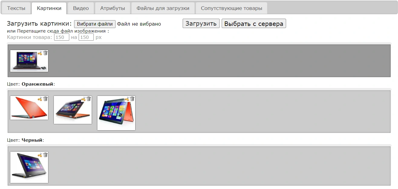 Вывод. Чтобы появилась возможность загружать разные изображения для разных цветов товара, необходимо::