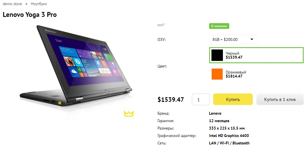 Модуль "Разные цвета товара" доступен на арендных пакетах Turbo Sales и Pro.