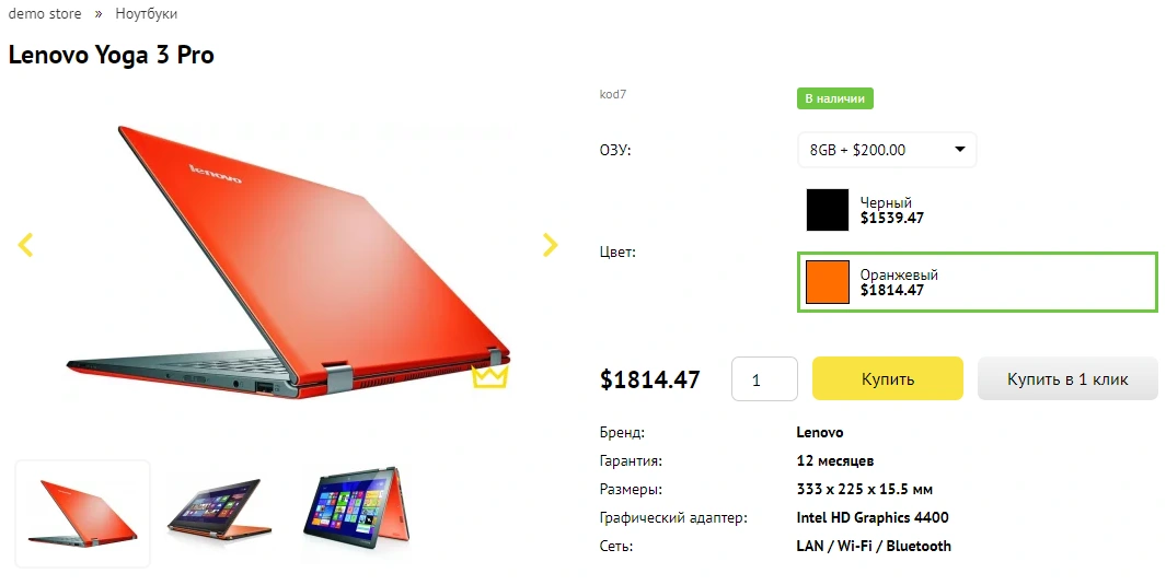 Если вы хотите, чтобы при выборе определенного цвета товара менялось и его изображение, это можно сделать с помощью модуля "Разные цвета товара".