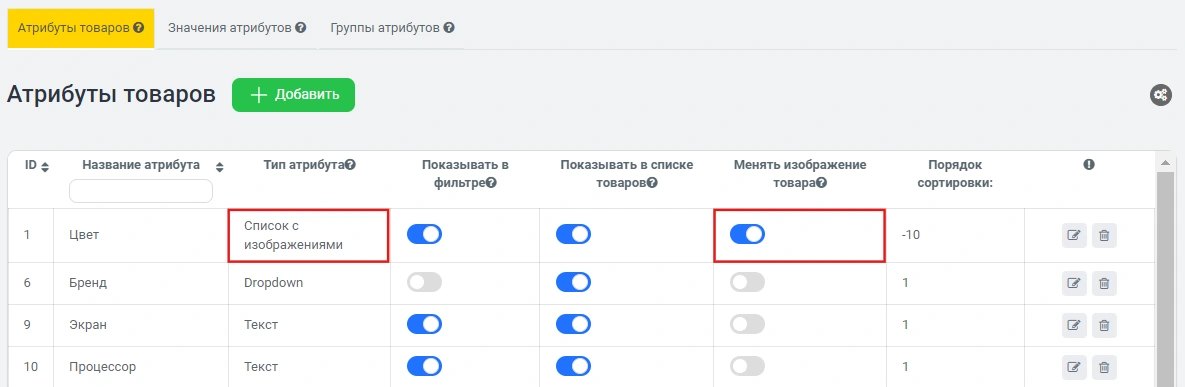 После этого создайте атрибут "Цвет" и значения для него, сделать это можно на странице "Товары" - "Атрибуты". Этот атрибут должен иметь любой тип, кроме типа "Текст", например, "Dropdown" или "Список с изображениями". Кроме того, в настройках атрибута включите переключатель "Менять изображение товара".