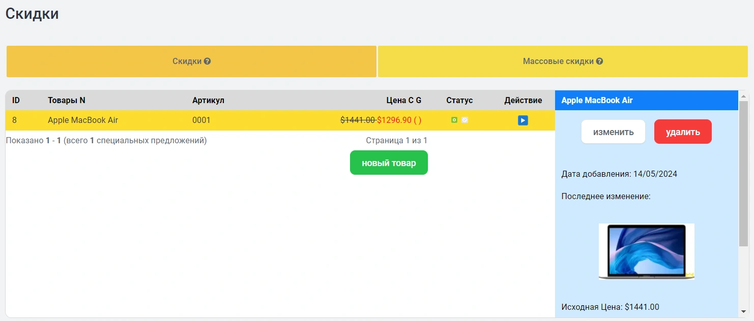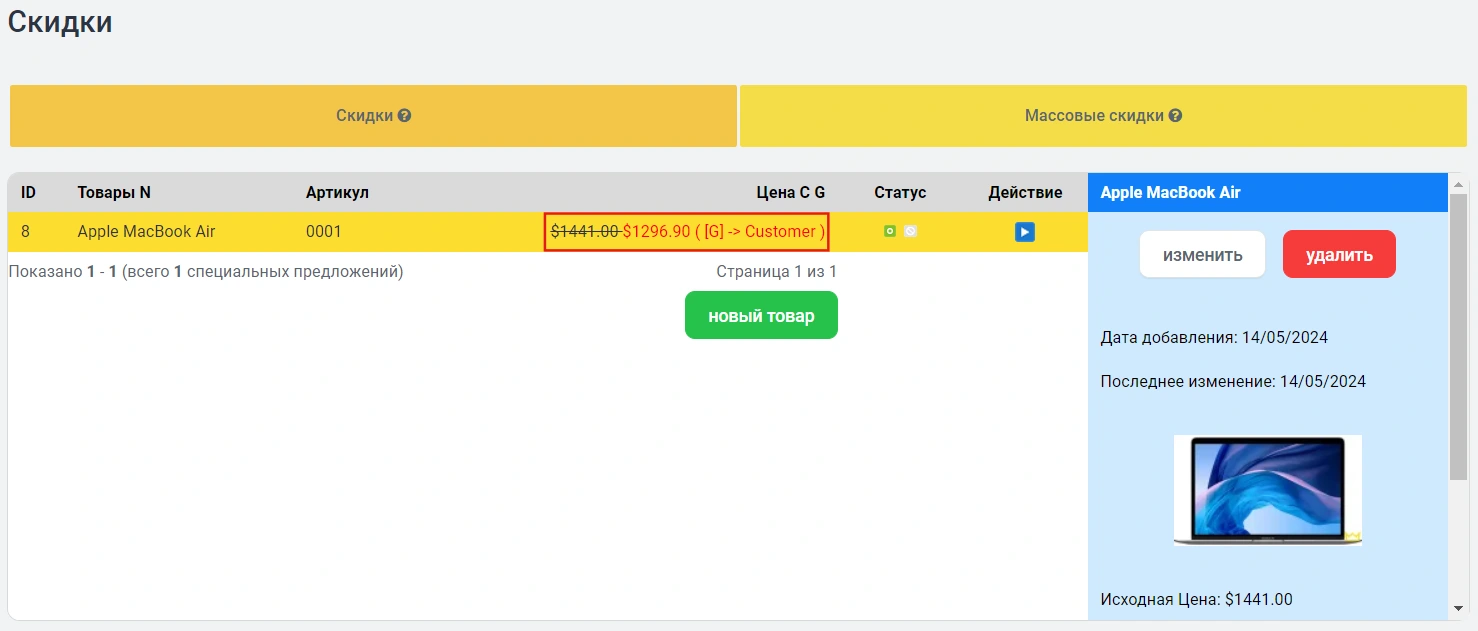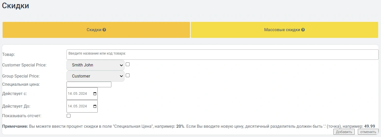 О работе с массовыми скидками можете прочитать в отдельной инструкции.