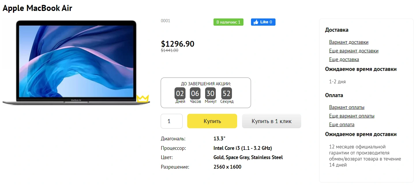 Если вы поставили отметку в поле "Показывать отсчет" при настройке скидки, то на странице товара со скидкой появится блок с обратным отсчетом.