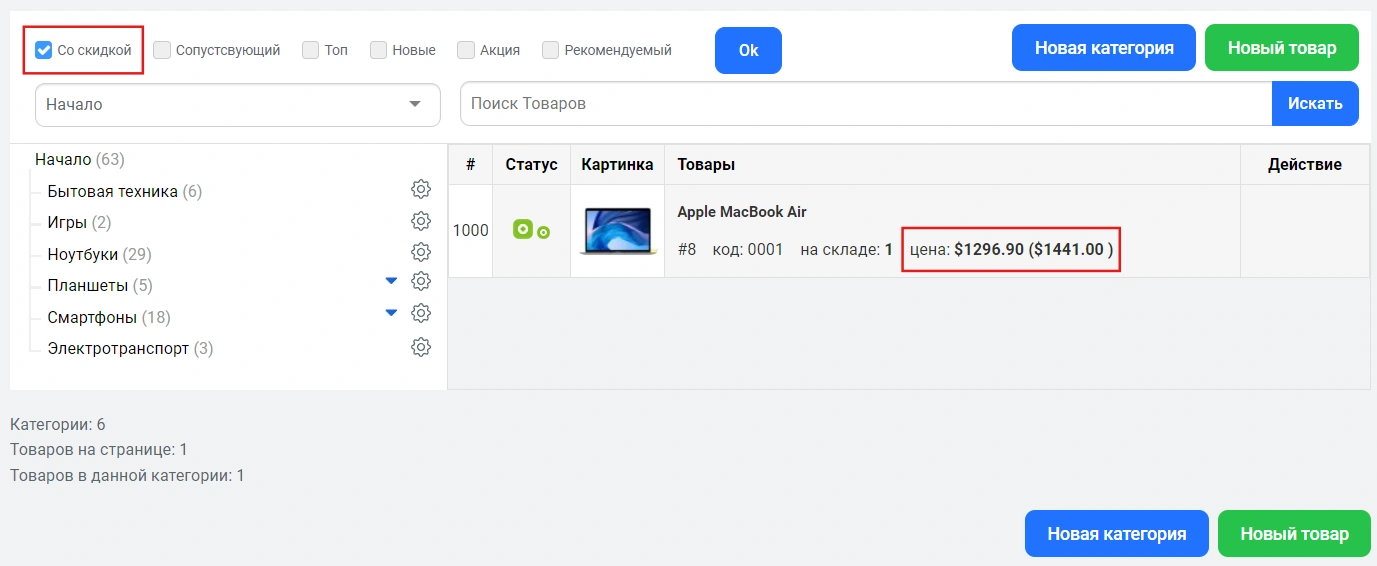 На странице "Товары" - "Каталог" скидки также будут отображаться. Кроме того, вы можете отфильтровать ваш каталог, чтобы увидеть все ваши акционные товары, поставив отметку в поле "Со скидкой" и нажав "Ок".