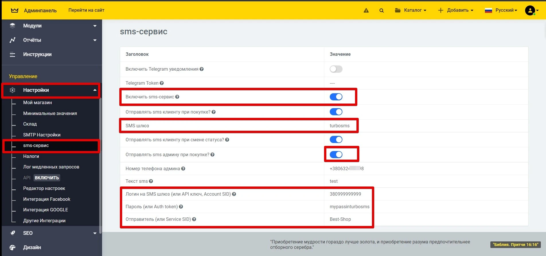 Перейдите в настройки модуля sms-сервис и заполните поля: