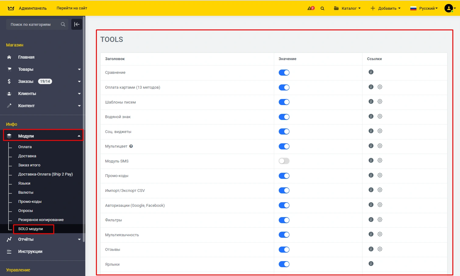 Команда Solomono разработала удобный функционал для работы с модулями. Управление модулями производиться через панель администрирования: «Модули» -> «SOLO модули» можно просмотреть список приобретенных уже модулей + список доступных к покупке.