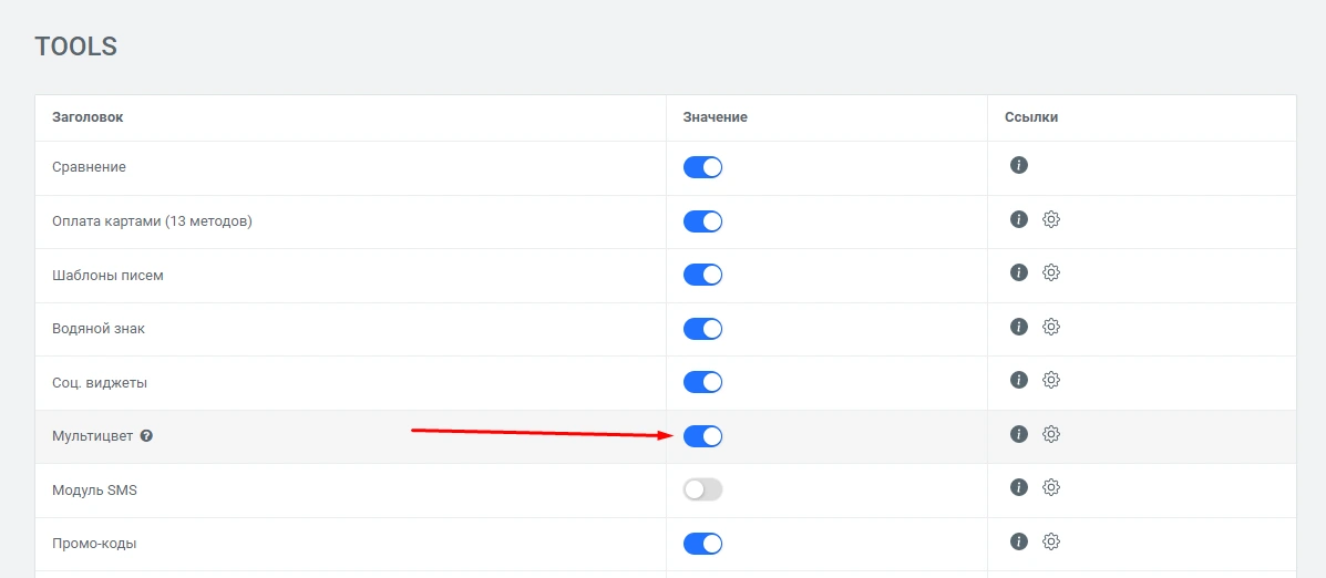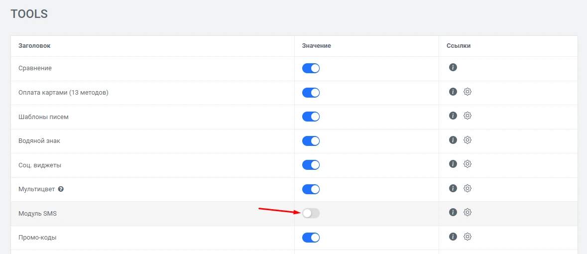 Если Ваш магазин находиться на хостинге платформы Solomono, то у Вас уже будут доступны дополнительные модули, но будут отображаться в неактивном состоянии, Вам нужно будет нажать на ричажок и активировать функционал: