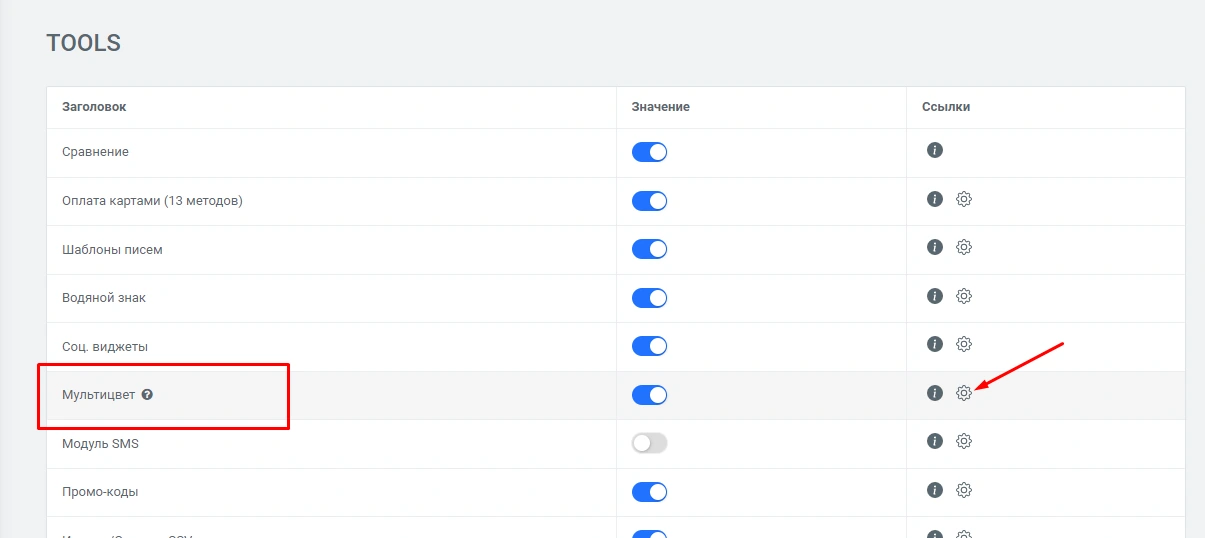Практически у каждого модуля, для Вашего удобства, разработаны свои настройки, Вы перейдете на них, нажав на иконку "шестеренки":