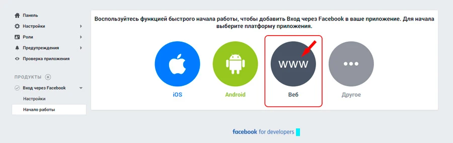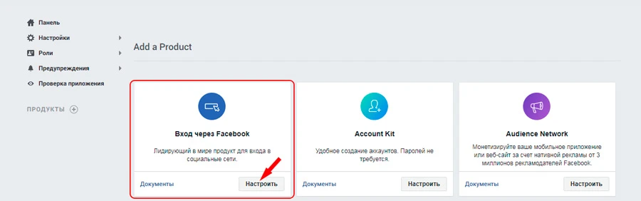 После того, как вы присвоили имя своему приложению, вам надо выбрать вкладку "Вход через Facebook" и нажать кнопку "Настроить".