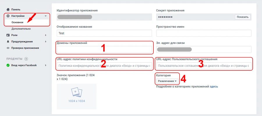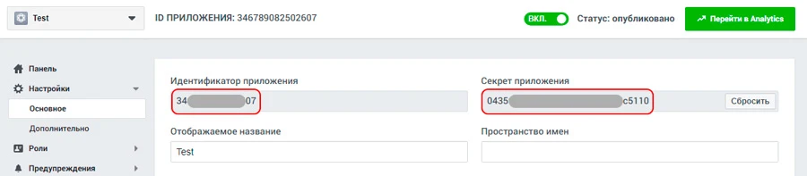 В этом же окне, мы копируем необходимые нам значения: "App ID" (Идентификатор приложения) и "App Secret" (Секрет приложения).