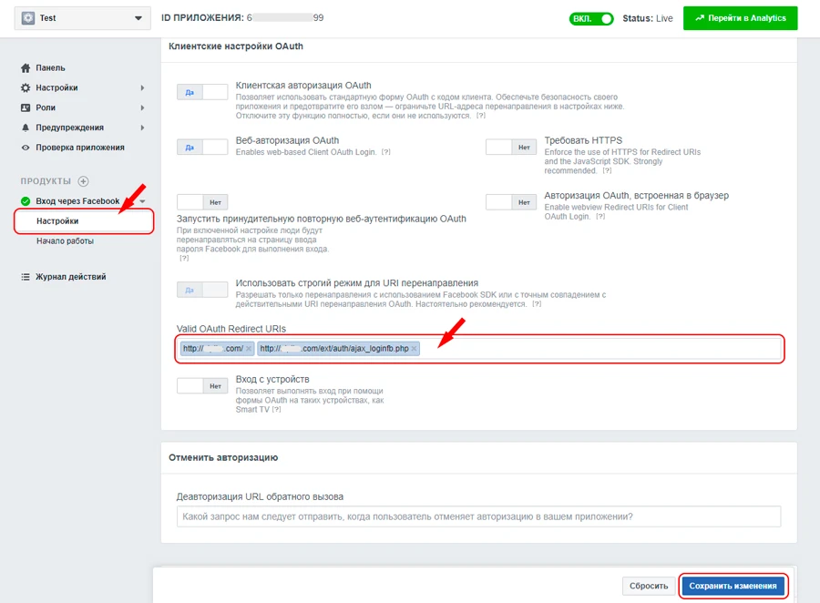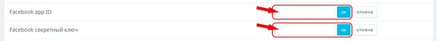 Для этого мы проходим "Настройки / Мой магазин" и напротив заголовка "Facebook app ID" вставляем значение которое мы скопировали в окне "Идентификатор приложения", а напротив заголовка "Facebook секретный ключ" вставляем значение которое мы скопировали в окне "Секрет приложения".