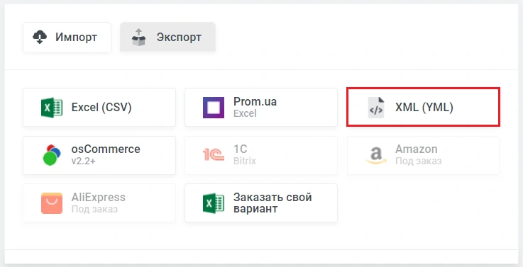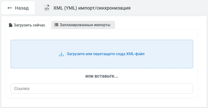 Чтобы осуществить импорт, перейдите на страницу "Товары" - "Импорт/Экспорт" - "Импорт" - "XML (YML)".