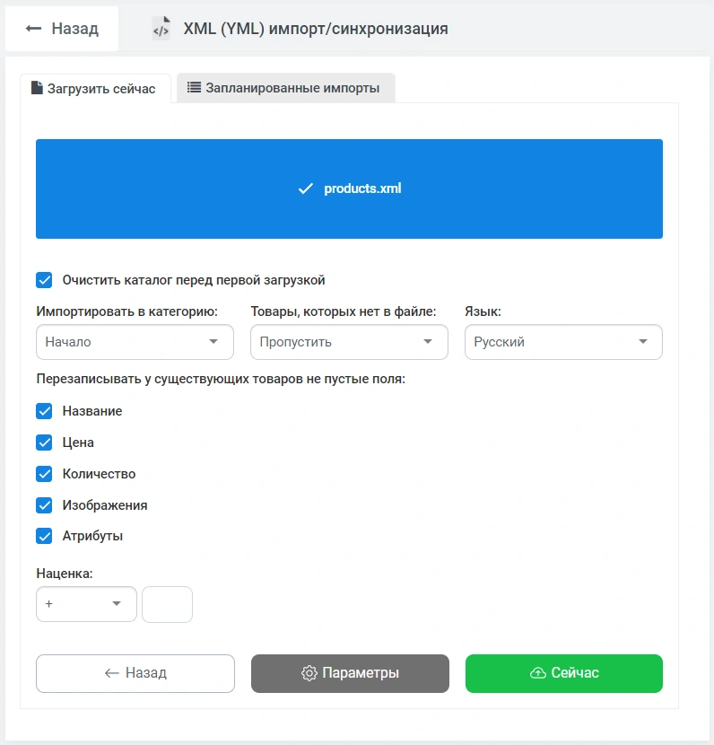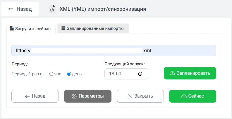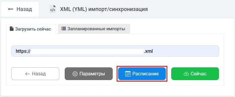 Кроме того, используя XML ссылку, вы имеете возможность запланировать импорт на будущее и таким образом обновлять ваш каталог. Чтобы сделать это, нажмите на кнопку "Расписание" после настройки.