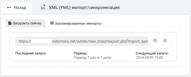 Если же вы хотите удалить запланированный импорт - вы можете сделать это на этой вкладке, нажав на кнопку удаления в строке со ссылкой.