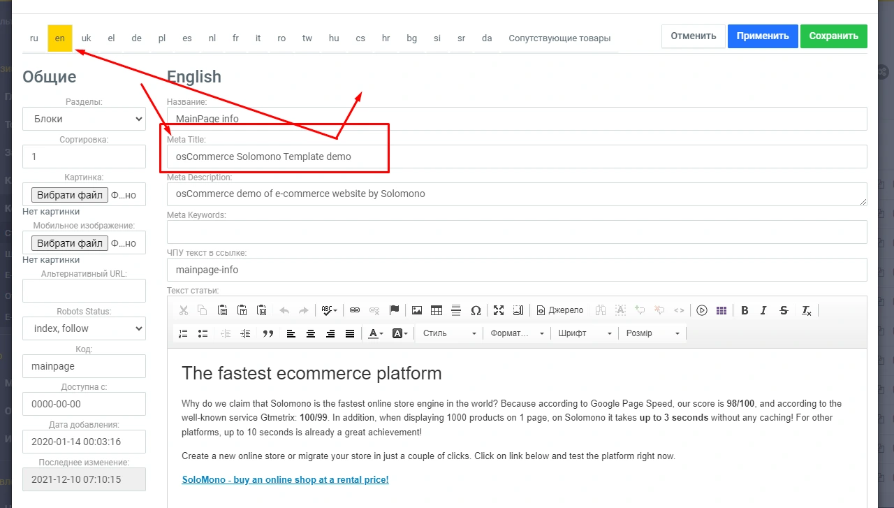 In the window that opens, in the Meta Title prescribe the desired text (in all available languages):