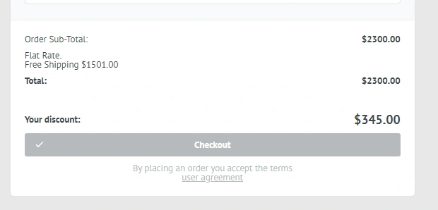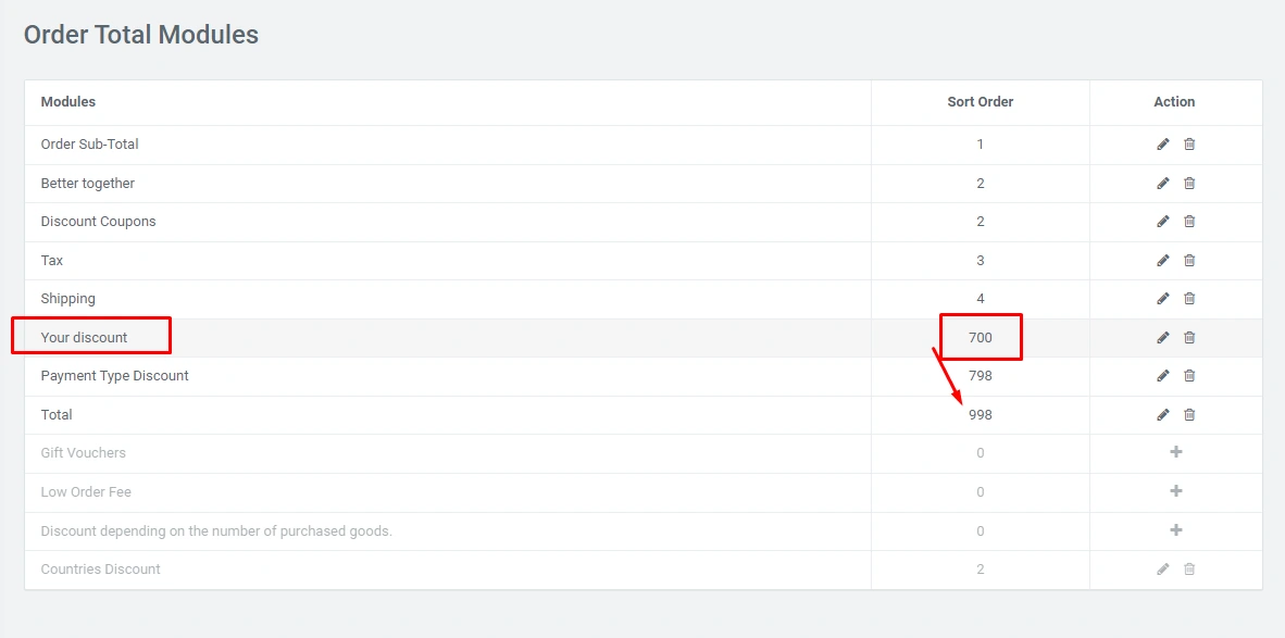 An important point is the sorting order of the discount module. It is important that "Your discount" be an order of magnitude higher than the "Total" module, then the amount in the calculation will be indicated minus the discount.