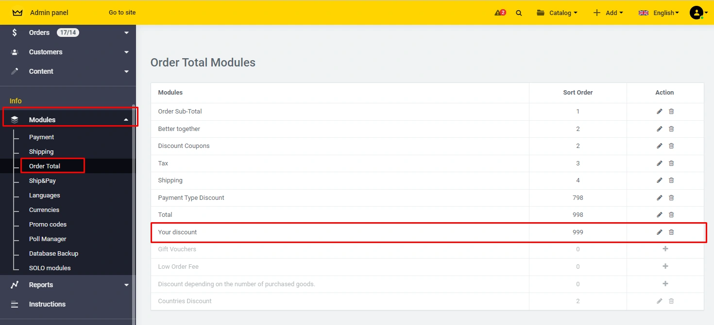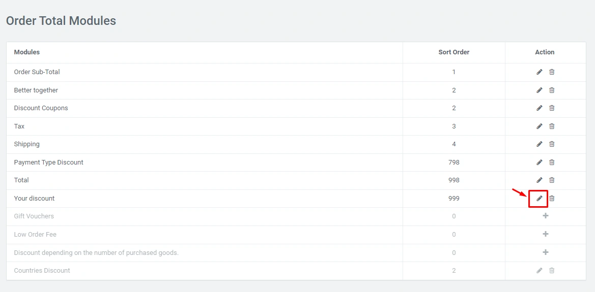 In the administration panel "Modules" - "Order total" - item "Your discount":