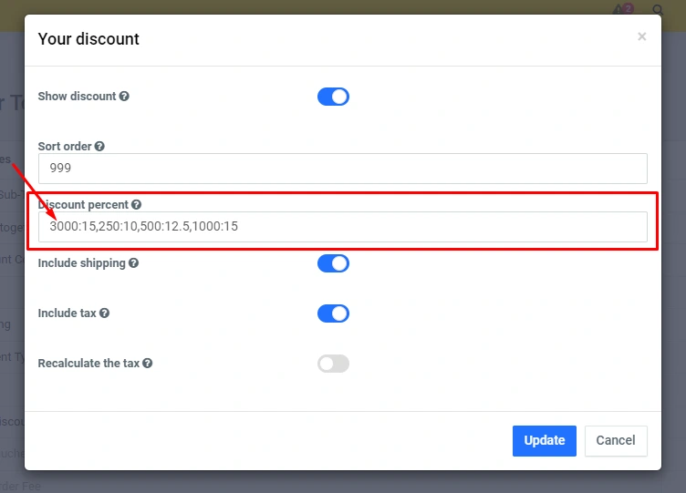 Аnd in the line "Percentage discount" set the price limits and percent discount, separated by commas: