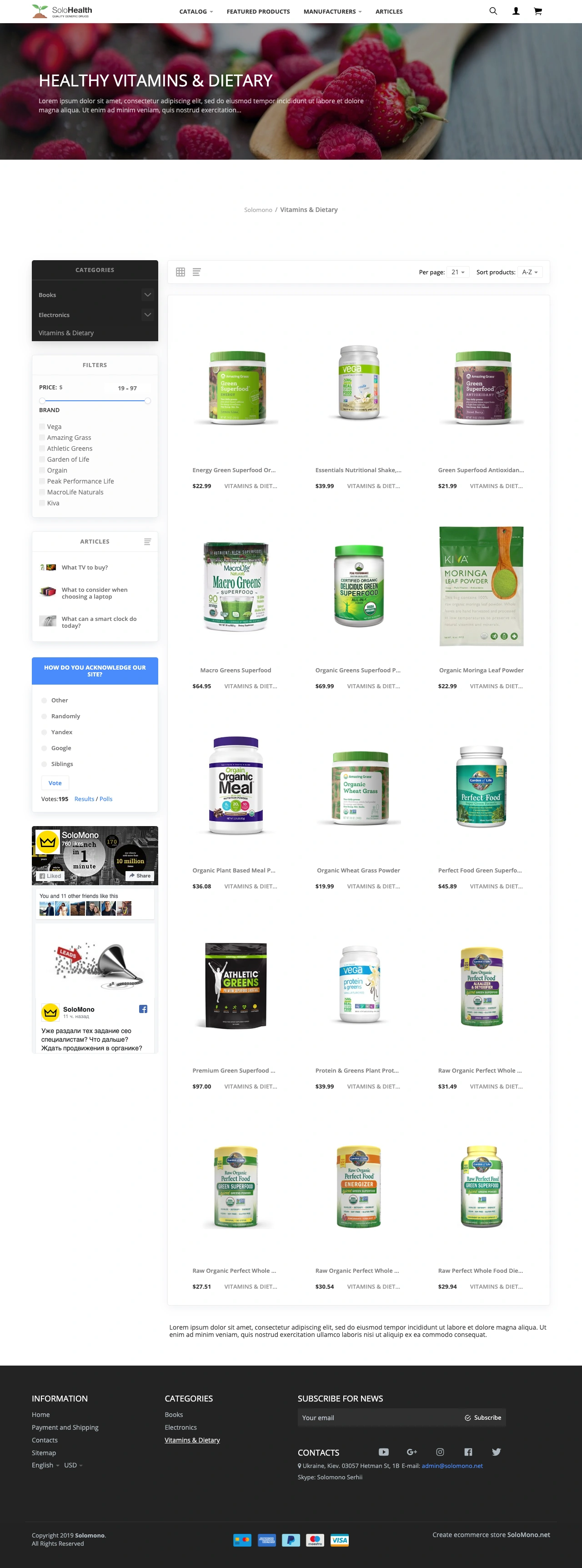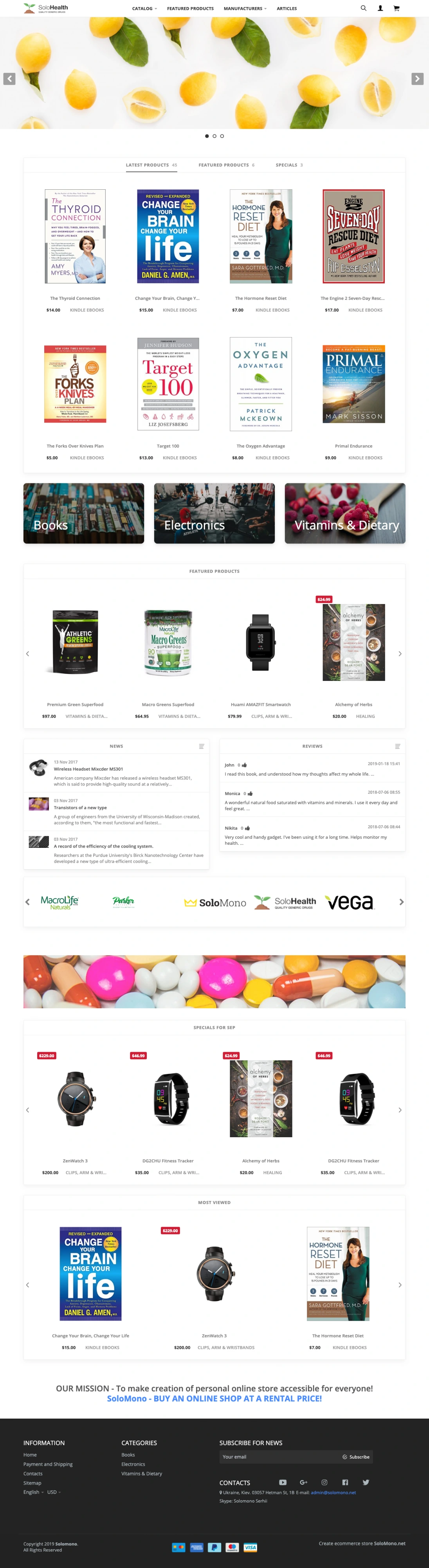 rnrnOne of the distinctive features of the Health template is its homepage with a sales banner that can be used to promote top products, special offers or important health information. The inclusion of Featured Products, Latest Products and Specials blocks with large images ensures that key products are immediately visible and attractive. This customization not only catches the attention of visitors, but also makes it easier for them to browse and shop. In addition, there is a special block for displaying the main categories of the store, which helps shoppers to quickly navigate to the sections they are interested in, enhancing the user experience.