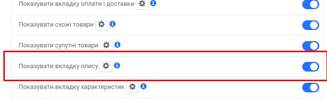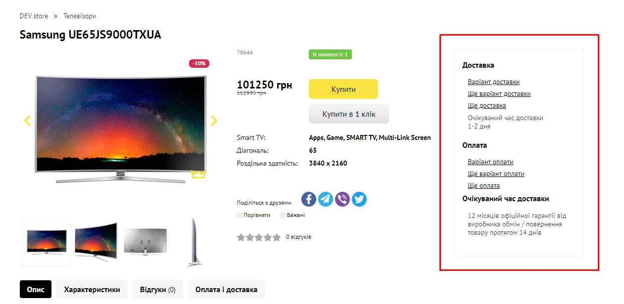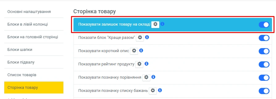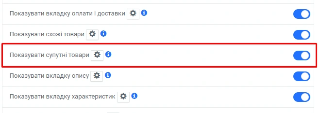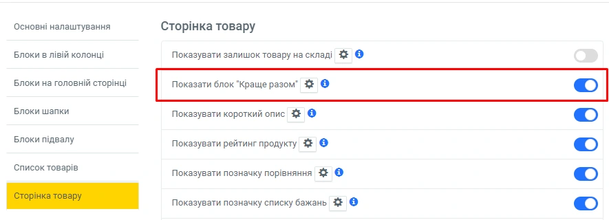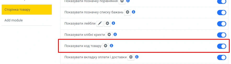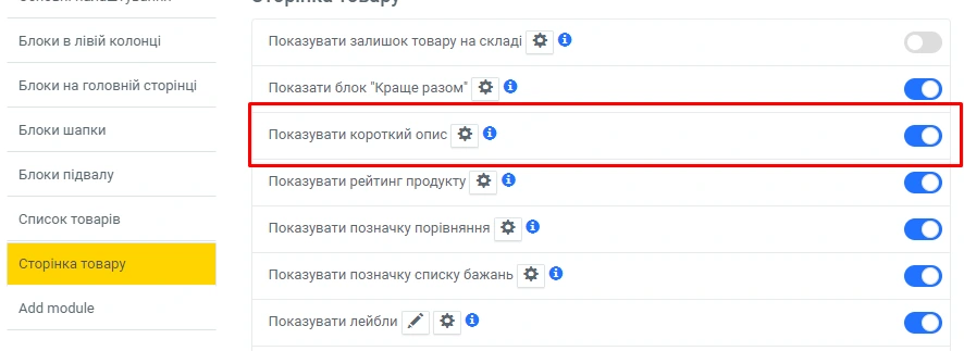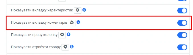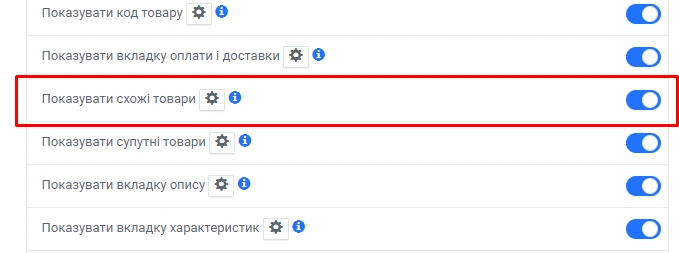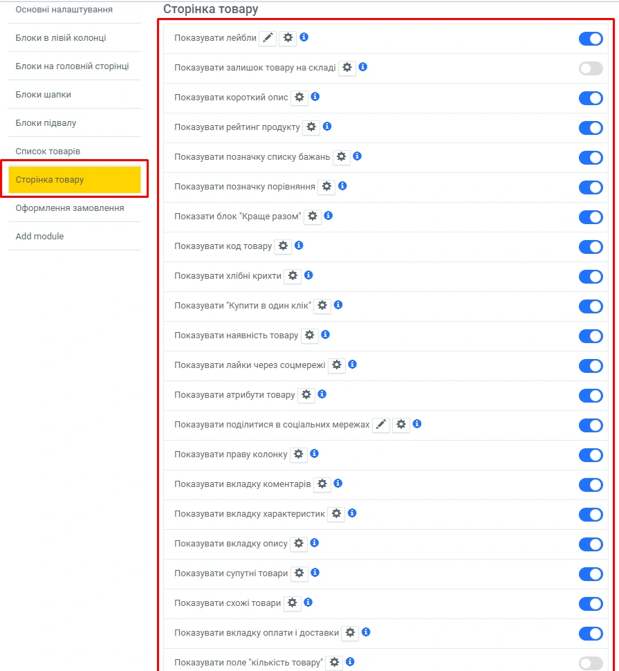 Налаштування Сторінки товару вашого сайту здійснюється через панель адміністрування: сторінка "Налаштування" - "Дизайн" - налаштування дизайну шаблону - розділ "Сторінка товару".