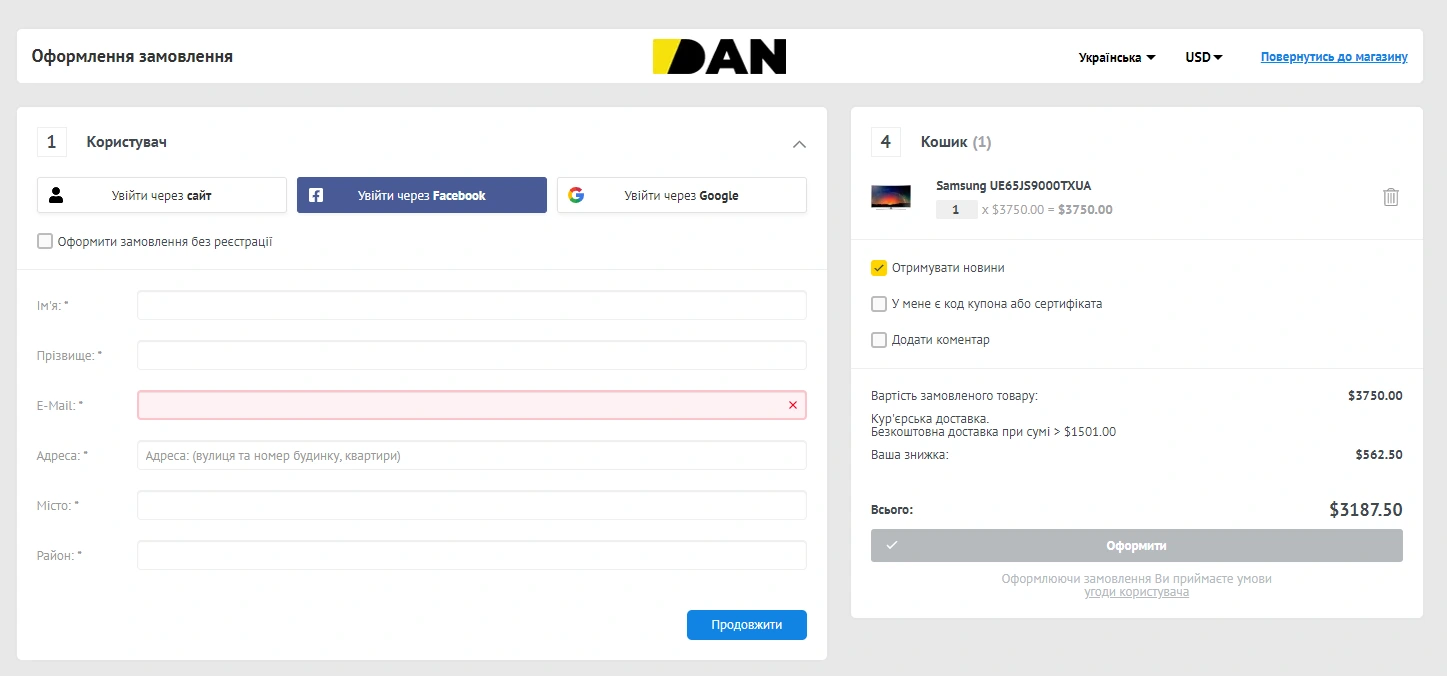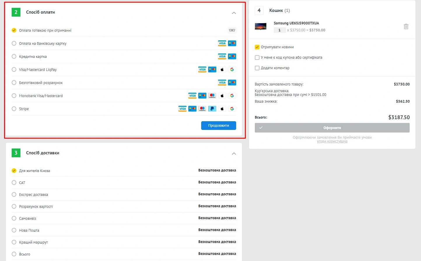 Такий підхід суттєво збільшує конверсію і загальний досвід використання сайту, зменшує час оформлення замовлення і час його обробки менеджером магазину, а так же зменшує контакт продавця з покупцем і ймовірність помилки менеджера.