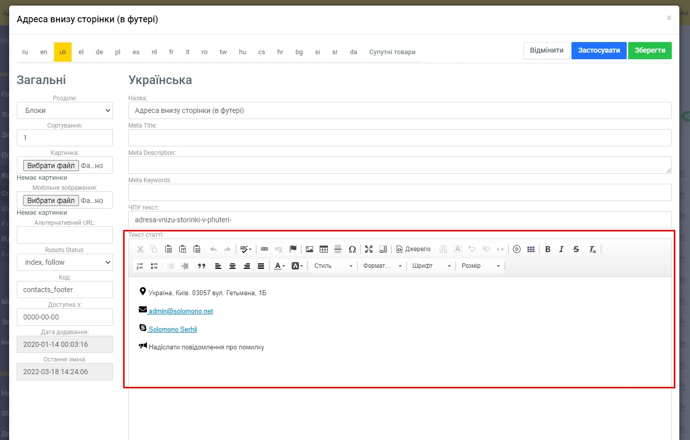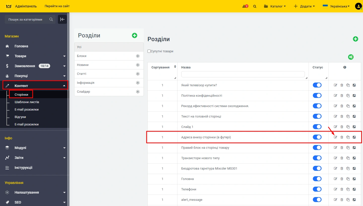 Додати/змінити адресу у футері (підвалі) Вашого інтернет магазину проводитися через панель адміністрування: «Контент» -> «Сторінки»
