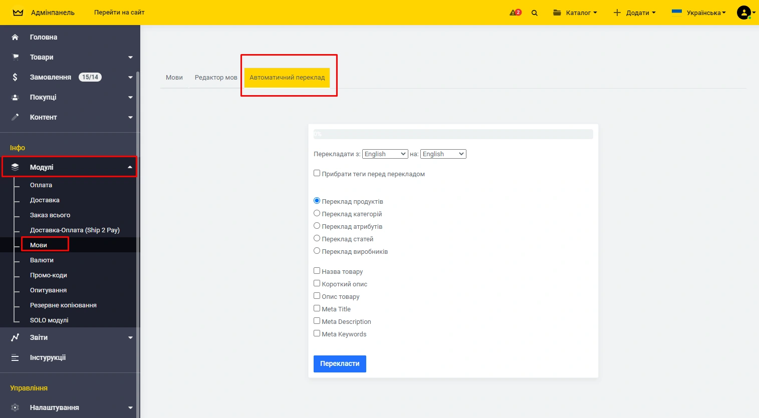 Управління перекладами здійснюється через панель адміністрування: -> «Модулі» -> «Мови», вкладка -> «Автоматичний переклад», де Ви вибираєте ту мову, яку включили та по черзі робите окремо переклад для продуктів, категорій, атрибутів та статей щоразу вибираючи все нижче.