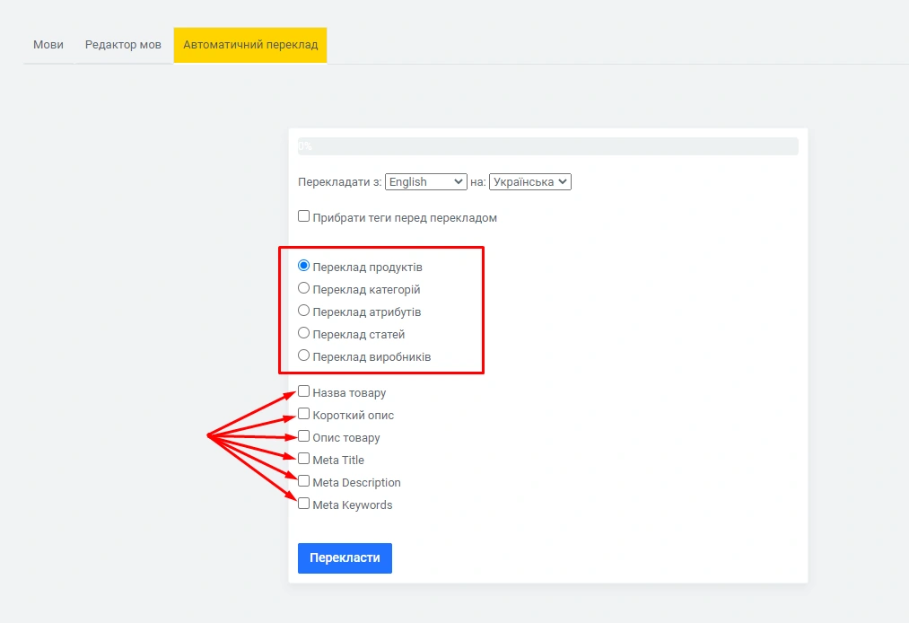 Для перекладу категорій, атрибутів, статей, виробників: Ви можете зробити автоматичний переклад даних позицій, на Вашу думку, і вибрати при цьому потрібні для них визначення.