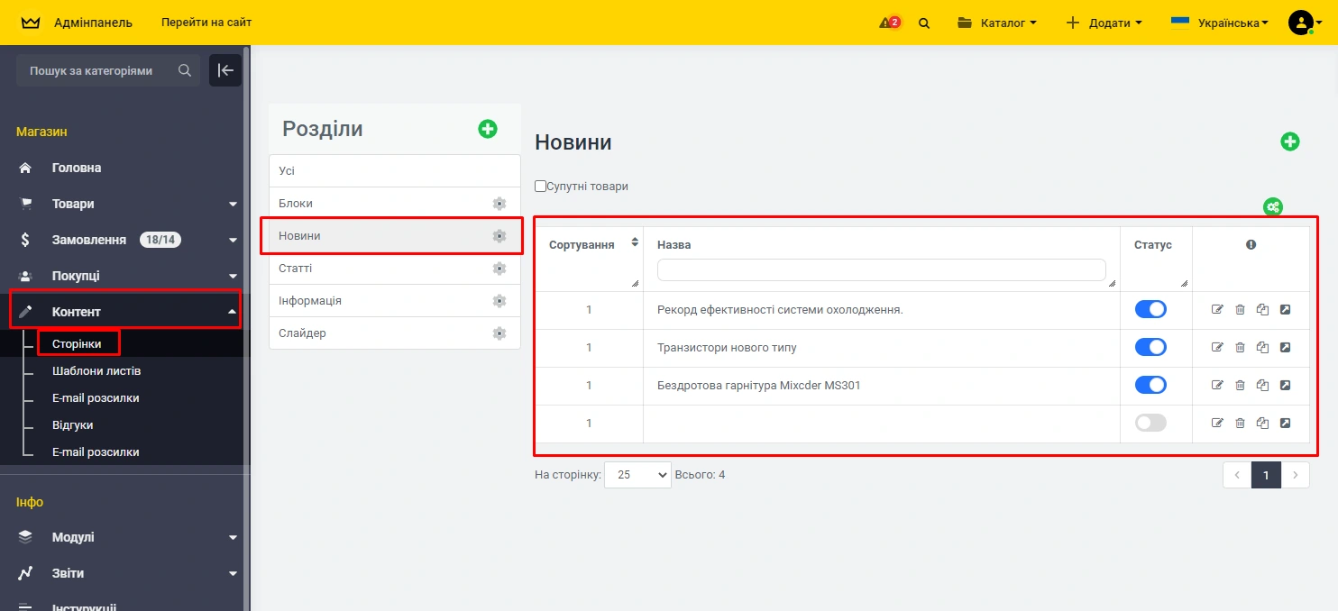 Управління контентом блоку новин здійснюється через панель адміністрування: «Контент» -> «Сторінки» -> «Новини»