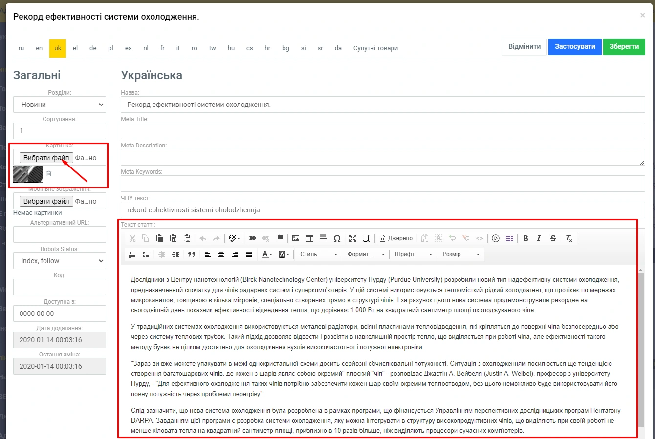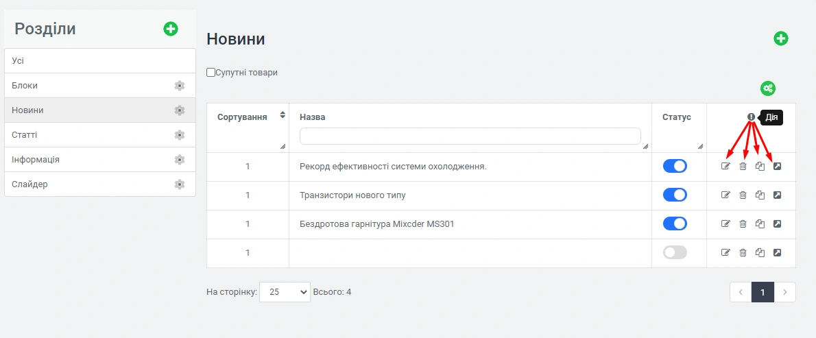 Натиснувши на редагування в колонці "Дія", у Вас є можливість самостійно керувати контентом новин: