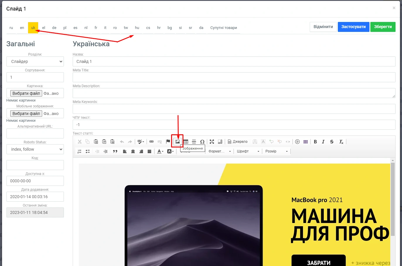 Щоб розмістити слайди для мобільної версії сайту, то на всіх доступних мовах Вашого сайту, потрібно завантажити картинку через іконку "Зображення":
