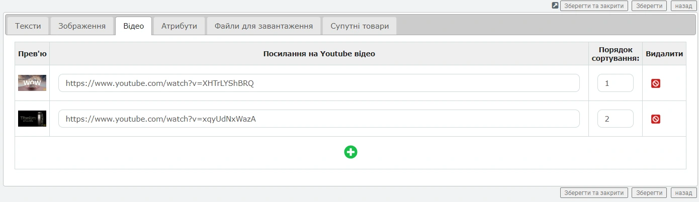 Поле "Порядок сортування" визначає, в якому порядку ваші відео відображатимуться на сторінці товару.