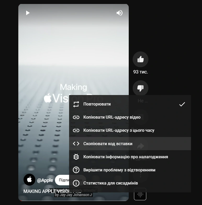 Якщо ви хочете додати YouTube Shorts відео, для коректної роботи посилання на нього потрібно скопіювати по-іншому. Натисніть правою кнопкою миші на відео та натисніть "Скопіювати код вставки".
