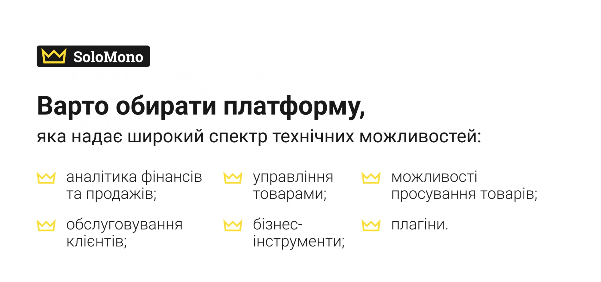 Власнику бізнесу потрібно зберігати фокус на стратегічному розвитку своєї діяльності. Тож платформа має бути зручною до використання, інтуїтивно зрозумілою й мати матеріали для швидкого опанування.