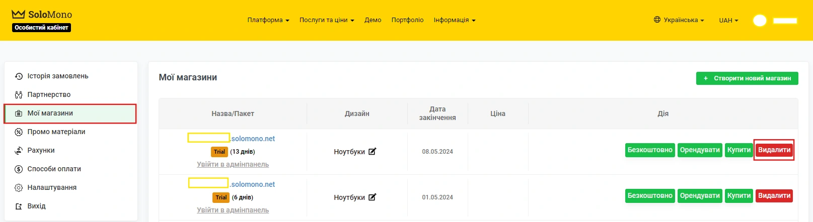 В особистому кабінеті перейдіть на вкладку "Мої магазини", де ви побачите список створених сайтів з можливістю видалити будь-який з них на кнопку "Видалити" праворуч від потрібного вам магазину.