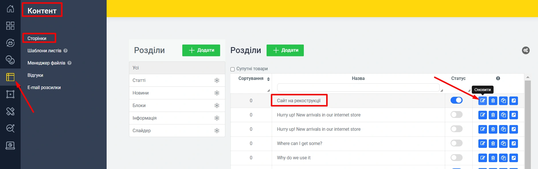 Також Ви маєте можливість відредагувати даний текст. Достатньо зайти у Контент - Сторінки і відредагувати статью "Сайт на реконструкції"