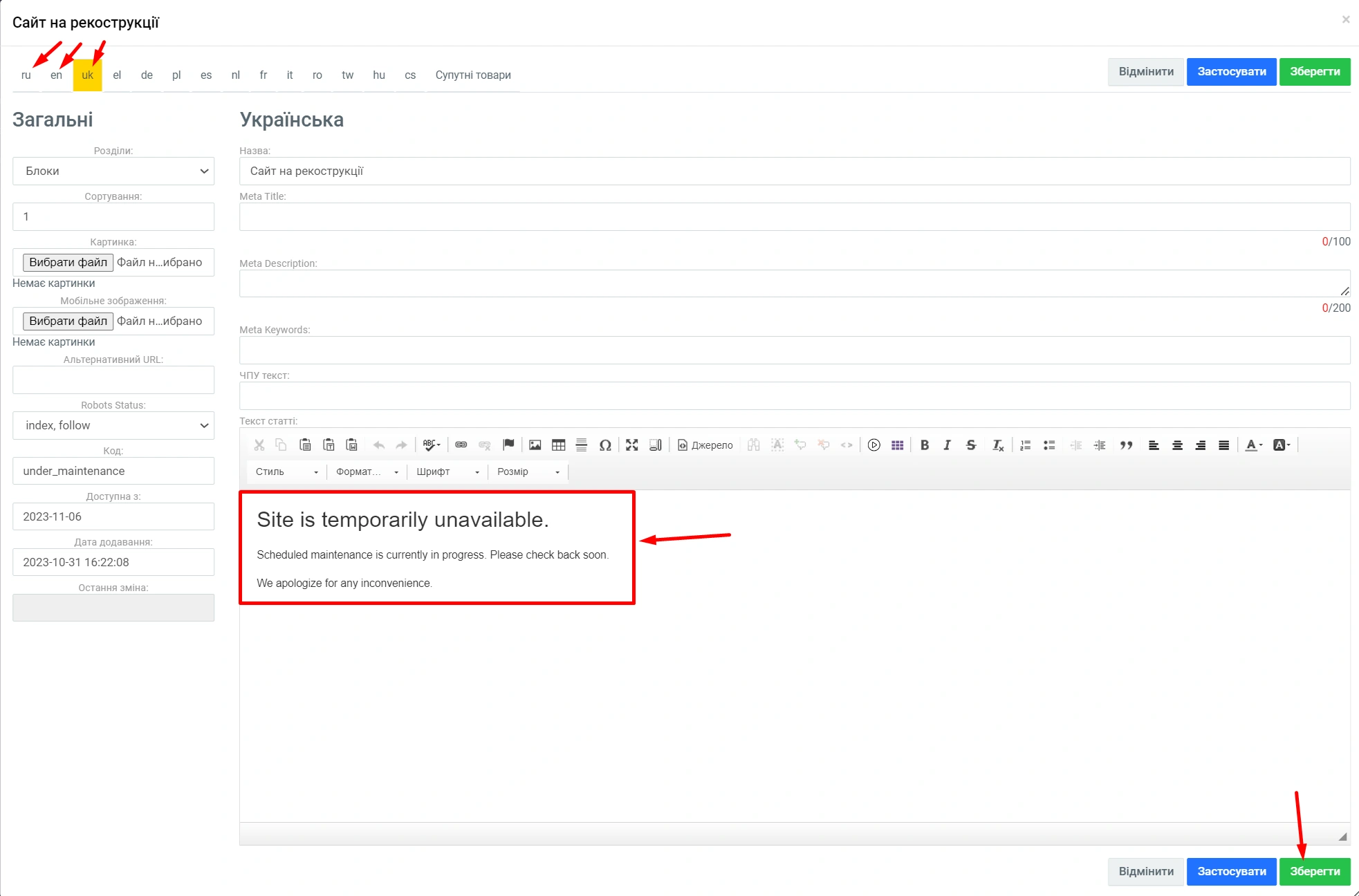 Заповніть текст на всіх мовах, які доступні на вашому сайті і натисніть Зберегти