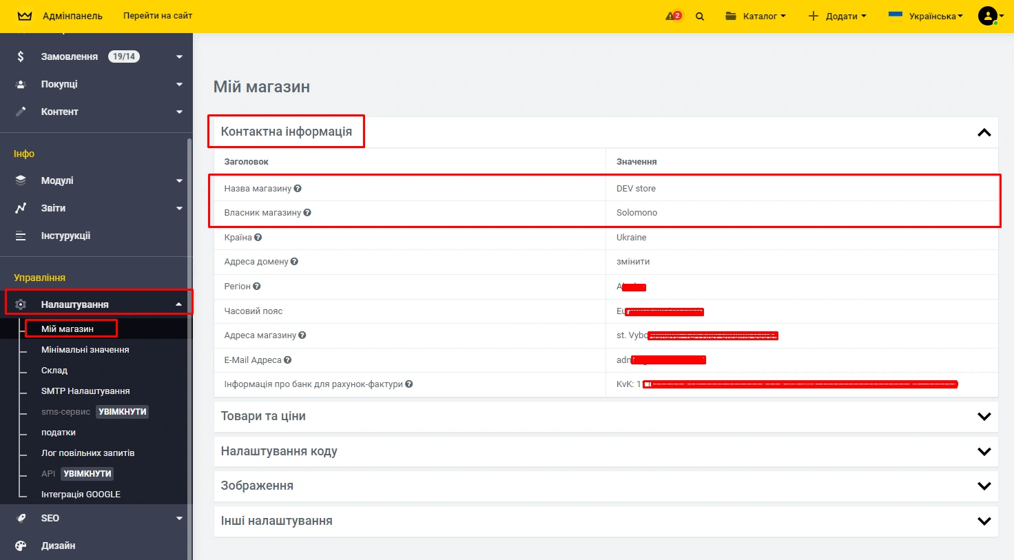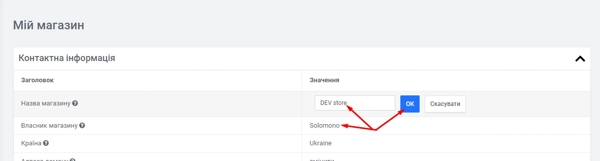 Команда Solomono розробила зручний функціонал для роботи з настройками магазину. І якщо у Вас є бажання змінити назву для Вашого магазину, Ви можете зробити це самостійно та дуже швидко. Також тут, Ви можете замінити власника магазину.