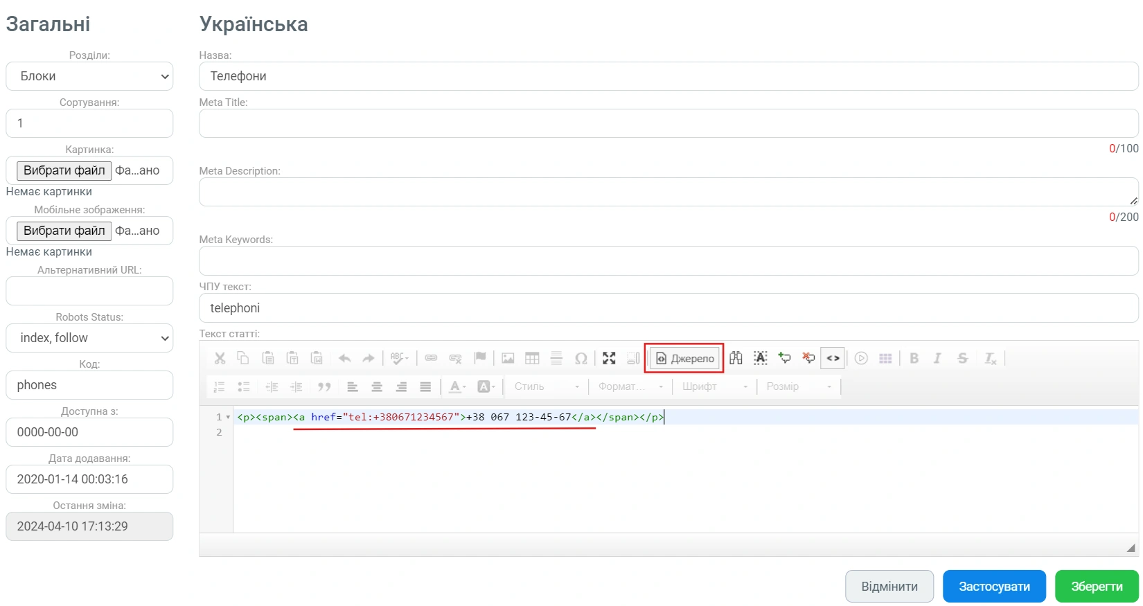 В цьому вікні натисніть "Джерело", номер телефону повинен бути обгорнутий в тег вигляду <a href=”…”>…</a>. В атрибуті href потрібно прописати tel: та номер телефону в повному форматі зі знаком + і без розділень.
