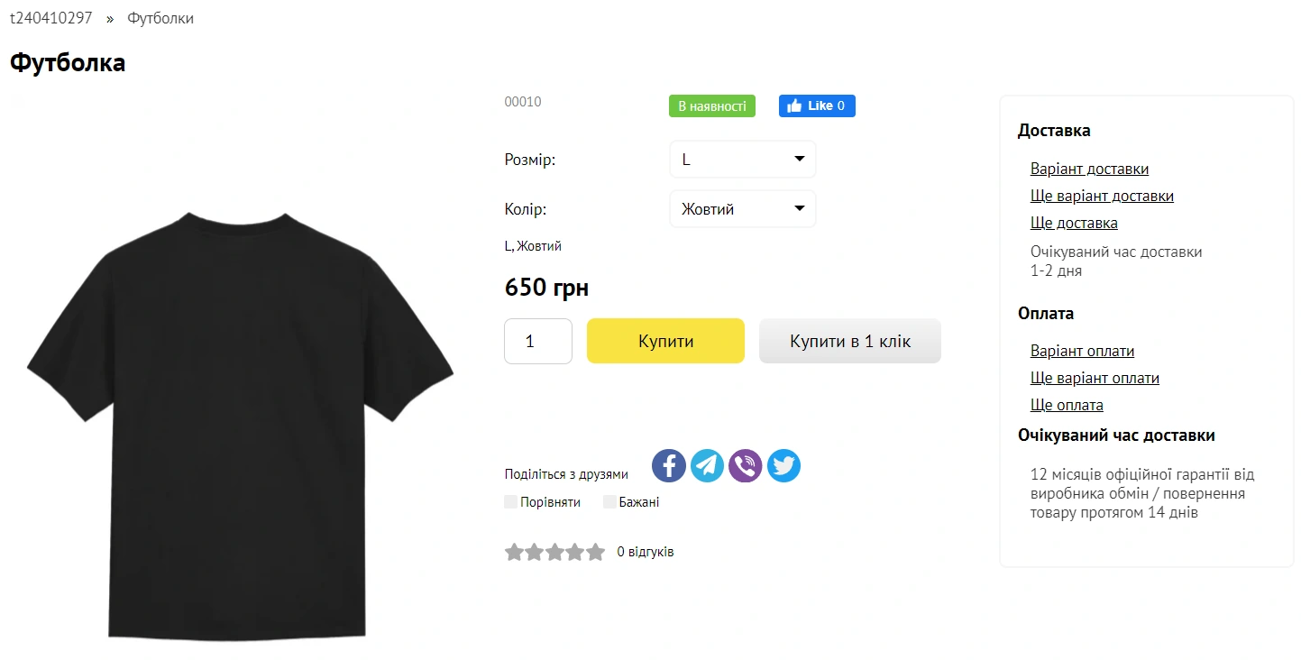 Після завершення, на сторінці вашого товару буде можливість обирати різні значення атрибутів, а ціна, кількість та артикул відображатимуться відповідно до того, що вказано в налашуваннях комбінацій. Наприклад, в даному випадку у випадаючих списках для атрибутів "Розмір" та "Колір" обрані значення "L" та "Жовтий" відповідно. Над ціною відображається рядок "L, Жовтий", а ціна дорівнює тій, що була вказана для цієї комбінації - 650. Також, ліворуч від позначки "В наявності" можна побачити артикул саме цієї комбінації - 00010.