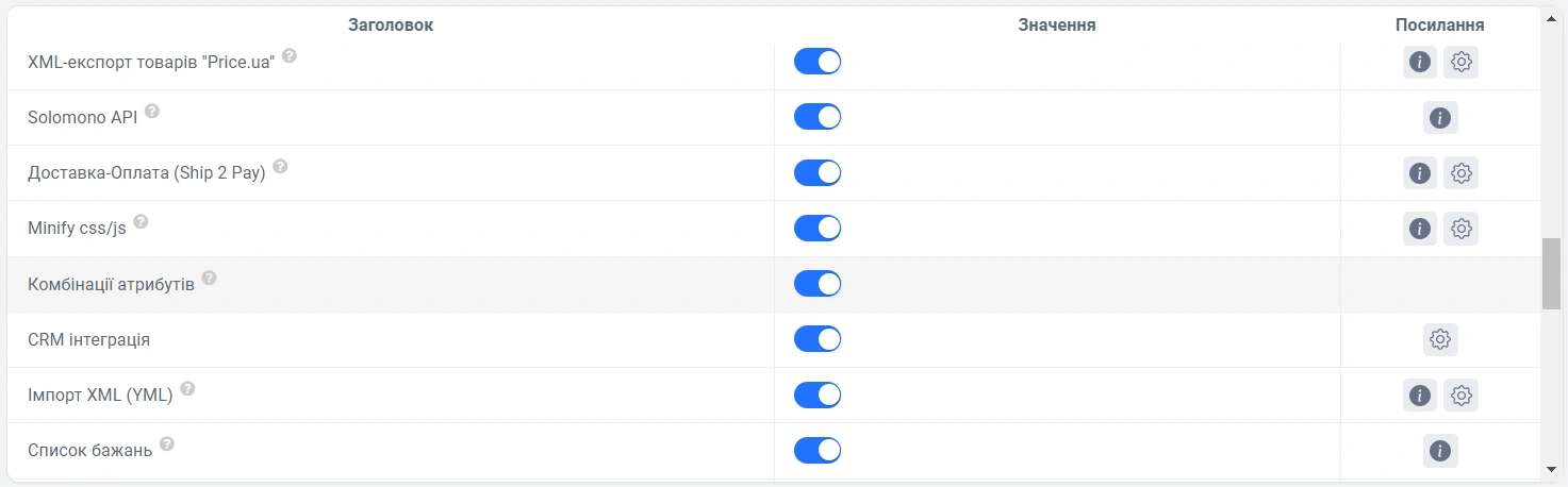 Щоб скористатись цим функціоналом, перш за все переконайтесь, що модуль "Комбінації атрибутів" увімкнено на сторінці "Модулі" - "SOLO модулі".