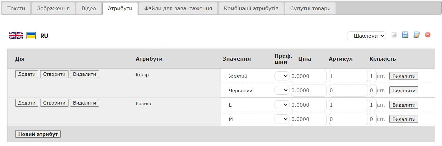 Комбінації атрибутів - це функціонал, що дозволяє на основі доданих в товар атрибутів додавати ціну, кількість та артикул на їх комбінації.