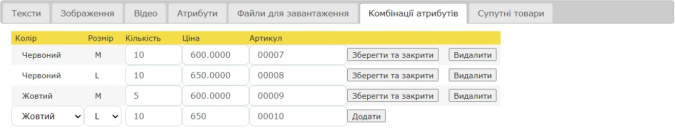 Тепер перейдімо до вкладки "Комбінації атрибутів". Для кожного атрибуту типу "Dropdown" ви побачите окремі колонки, в яких у випадаючому списку ви можете обрати потрібні вам комбінації значень атрибутів. Для кожної комбінації ви можете вказати кількість, ціну та артикул. Після того, як ви заповните колонки, натисніть "Додати". Щоб видалити комбінацію, натисніть "Видалити" праворуч від неї.